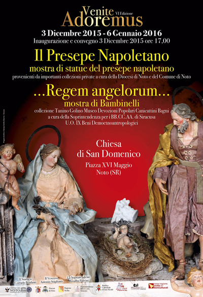 Dal 3 dicembre 2015 al 6 gennaio 2016 presso la chiesa di San Domenico (piazza XVI Maggio) in Noto, sarà possibile visitare due mostre allestite in occasione delle prossime festività natalizie: “Il Presepe Napoletano”, mostra di statue del presepe napoletano provenienti da importanti collezioni private, a cura della Diocesi di Noto e del Comune di Noto. L’altra mostra “Regem angelorum”, riguarda statue di bambinelli della collezione “Tanino Golino Museo Devozioni Popolari Canicattini Bagni”, a cura della Soprintendenza per i BB.CC.AA. di Siracusa U.O. IX Beni Demoetnoantropologici.